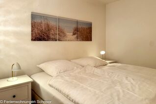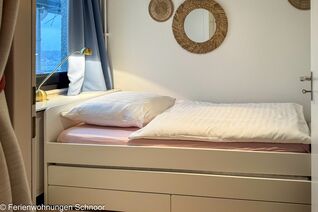 Der Schlafbereich mit einem gemütlichen Doppelbett (160x200) ist durch eine Wand vom Wohnraum abgetrennt. In einem separaten Zimmer gibt es zwei Einzelbett (90x200) für eine dritte und vierte Person. Dieser Raum kann mit Gardinen abgedunkelt werden. Das Badezimmer verfügt über eine Dusche und einem großen Spiegel. Vom Balkon aus hat man einen wunderbaren seitlichen Meerblick über die Strander Bucht. Dort steht ein Tisch mit zwei Stühlen zur Verfügung. Mit der Balkonverglasung kann man den Balkon jederzeit nutzen.