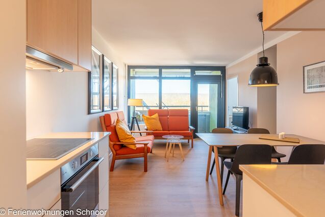 Der offene Wohn- und Essbereich ist lichtdurchflutet und verfügt über zwei komfortable 2 Sitzer, einen LCD-Fernseher und einen Esstisch für vier Personen. Die angrenzende Küche ist mit einem Cerankochfeld, einem Backofen, einem Kühlschrank mit Gefrierfach und einem Geschirrspüler ausgestattet. Auch eine Kaffeemaschine, ein Toaster und ein Wasserkocher sind vorhanden. Es steht auch eine Mikrowelle zur Verfügung.